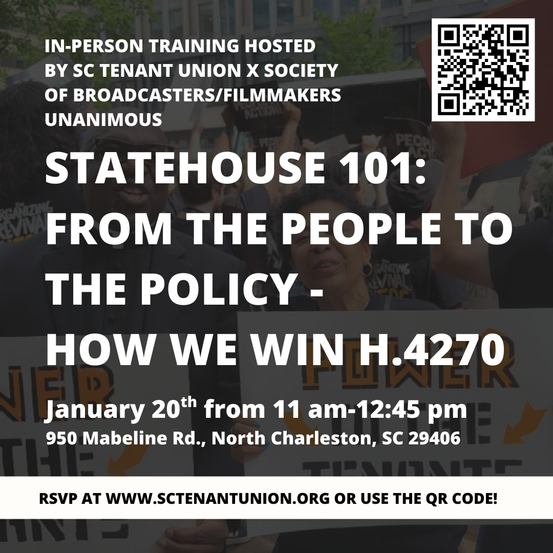 This one-hour training with SC Tenant Union and Society of Broadcasters/Filmakers Unanimous (SOBFU) will help tenants, union members, community members, and allies understand how South Carolina’s legislative process works and how to effectively talk to their representatives about the Eviction Record Sealing Bill (H.4270).
